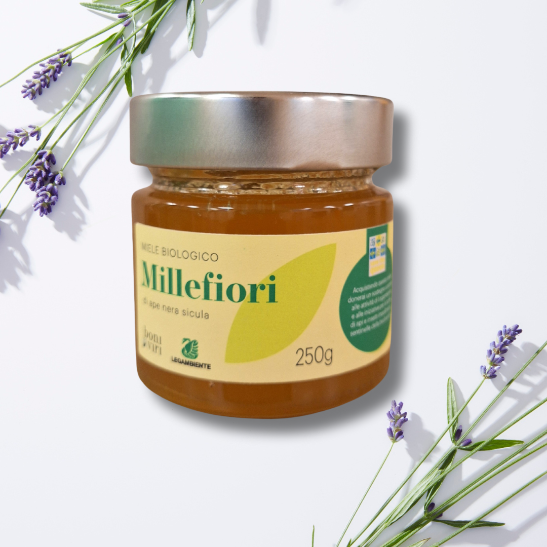 Il Miele Millefiori di Ape Nera Sicula nasce in Sicilia da piccoli apicoltori che custodiscono con cura questa preziosa specie autoctona, oggi a rischio. È un miele biologico, grezzo e non trattato, ricco di profumi e proprietà naturali, raccolto seguendo il ritmo delle fioriture locali.